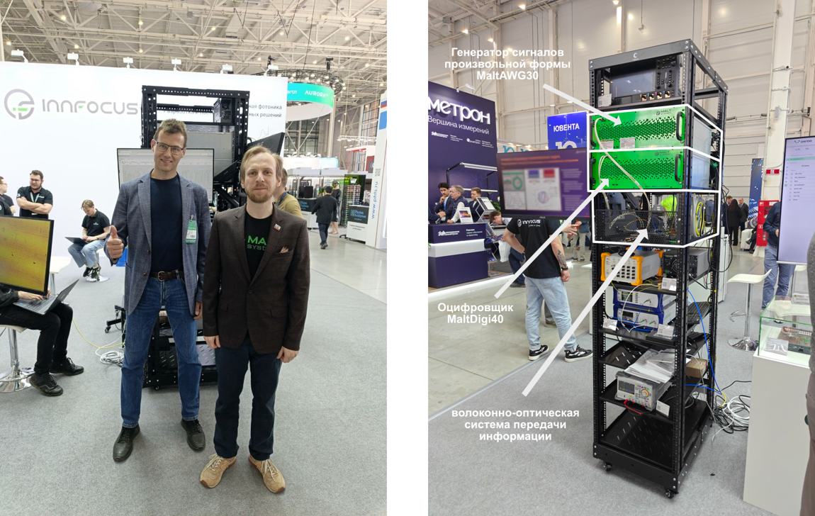 На стенде нашего партнера, компании INNFOCUS (ИННФОКУС), были представлены наши актуальные решения в области широкополосного контрольно-измерительного оборудования. Для демонстрации современной оптоэлектронной системы на стыке СВЧ и фотоники был собран стенд, содержащий широкополосный генератор сигналов произвольной формы MaltAWG30, волоконно-оптическую систему передачи информации и оцифровщик MaltDigi40.